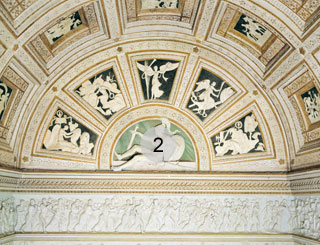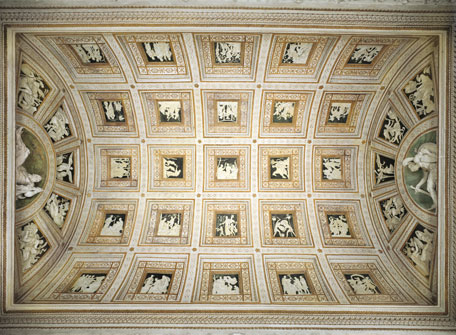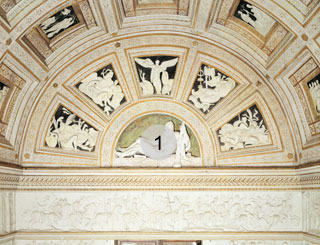 Volta/Vault È istoriata da 25 riquadri, con bassorilievi ispirati ai cammei classici per la delicata definizione delle forme e il contrasto tra il rilievo candido e il fondo nero.I soggetti sono classici, eccetto un Battesimo (fila centrale, secondo riquadro dalla finestra). It is divided into 25 panels decorated with bas-relief work. The delicate definition of the shapes and contrast between the white relief work and black background are reminiscent of classical cameos. The subjects are all classical except for a Baptism (central row, second panel from the window). |